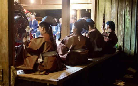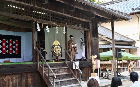 九月の陽射しは、まだ容赦がない。けれど神社境内を渡る風に、ふと秋の匂いがした。昨日の激しい雨が嘘のような快晴である。空の青さが、今日という日を寿いでいる。 通夜殿前に、丸イスが並んでいく。緑のテントが張られ、舞台が整って...