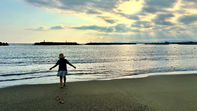 太平洋に注ぐ、雲間からの光が神々しい。私たちは、日暮れの海辺に立っていた。まとわりつく湿った潮風が、ぬるま湯のように肌にからみ、じわじわと体を火照らせる。