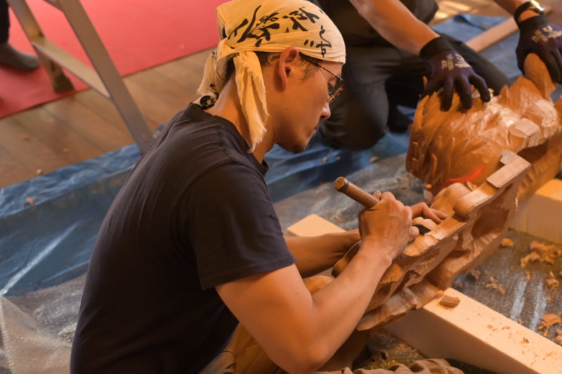 扱いの繊細な麒麟像に対して、迷いなく、勢いよくノミを振るう仏師。 「結構いきますね、すごいですね」と大工さんが漏らしたその言葉には、同じ木を扱う者としての敬意がにじんでいた。