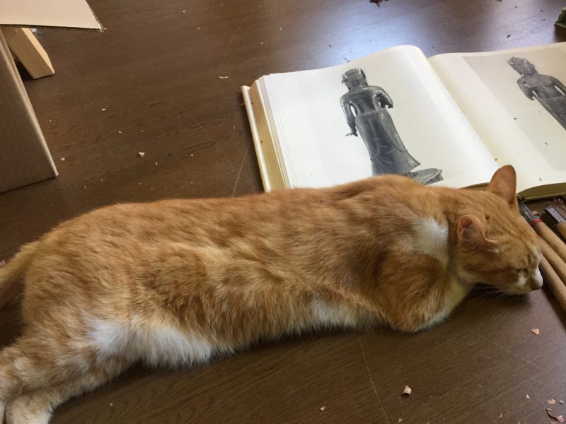 当工房が、実家の納屋を作業場にしていた頃には、夏は涼みに、冬は暖をとりに、吉田仏師のそばにやってきてはくつろいでいた。楽しく、マイペースな猫だった。