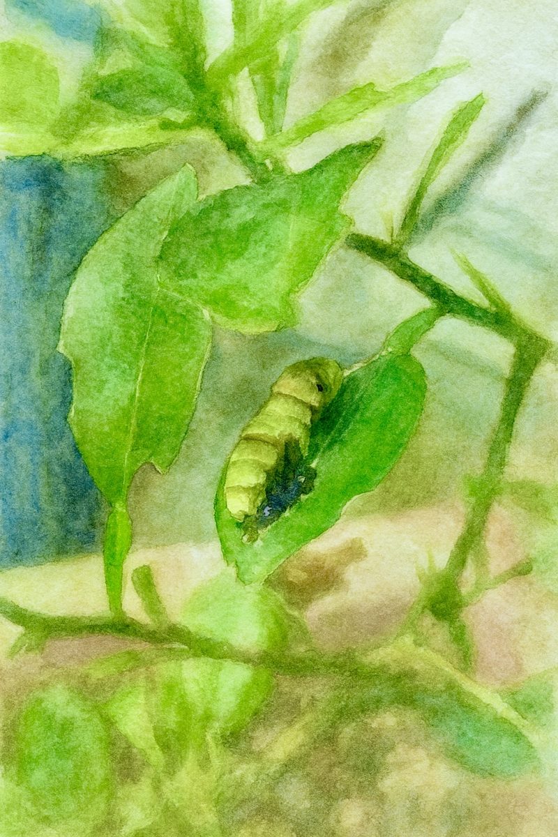 彼岸が過ぎてふと鉢に目をやると、葉の多くが虫に食われていた。残った葉の上に、何やら黒いもの。黒と白のまだら模様の幼虫がひたすら食み続けていた。ようく目を凝らすと、緑色の幼虫もいた。「あ、蝶の幼虫だ」