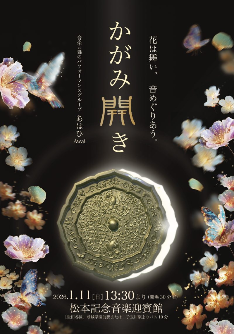 音楽と舞で独自の空間を立ち上げるパフォーマンスグループ「あはひ-Awai」。彼女たちの令和8年の新春公演のチラシを、担当させていただいた。