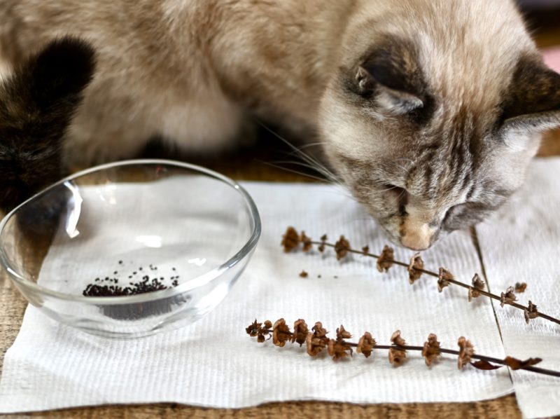 猫の皓月(こうげつ)も、強い香りに惹かれてやってきた。フンフンと枯れた茎に鼻をつけ、ペロリと舐めると、枯れたバジルがカサリと音を立てた。