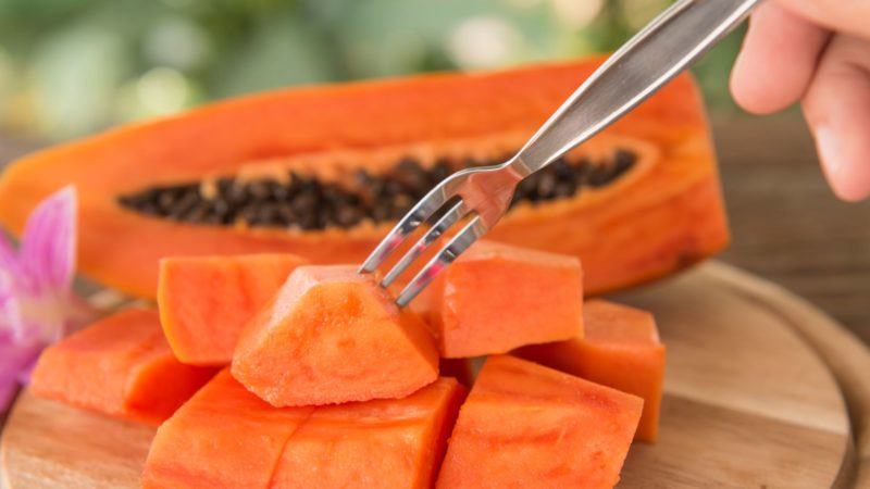 籠の中から一番熟れたものを選ぶ。 パパイヤを2つに割る。 キャビアのような種を掻き出す。 マンゴー、アボカドとともに一口大に切り、ライムをひと絞り。