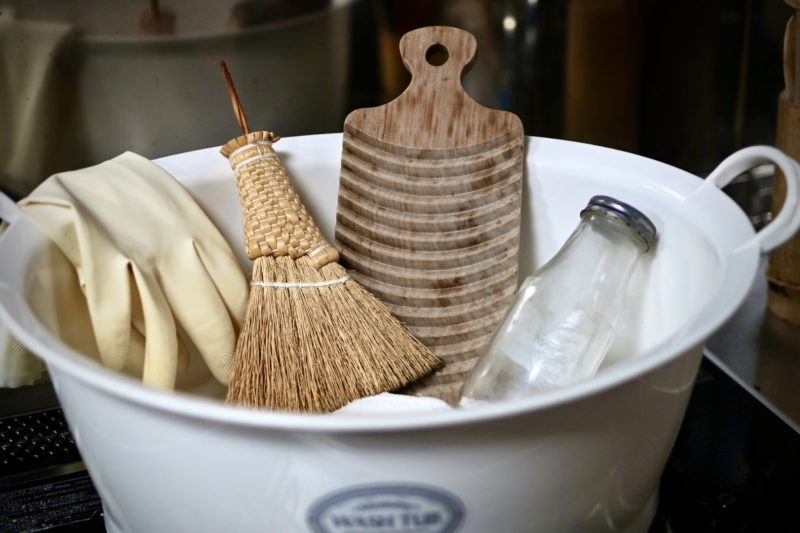 目処がついたところで、雑巾を洗うために桶に水を張った。取り出したのは、気に入りの洗濯板。桜の木でできた小ぶりの品で、もう20年くらい使っている。