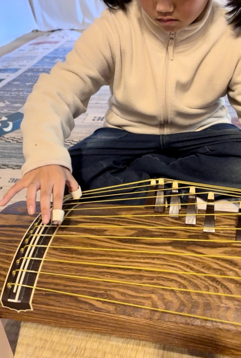 アイキャッチは、父親の大きな箏爪をうまく使って、平調音取をつまびく雲中奏楽団の団員です笑。